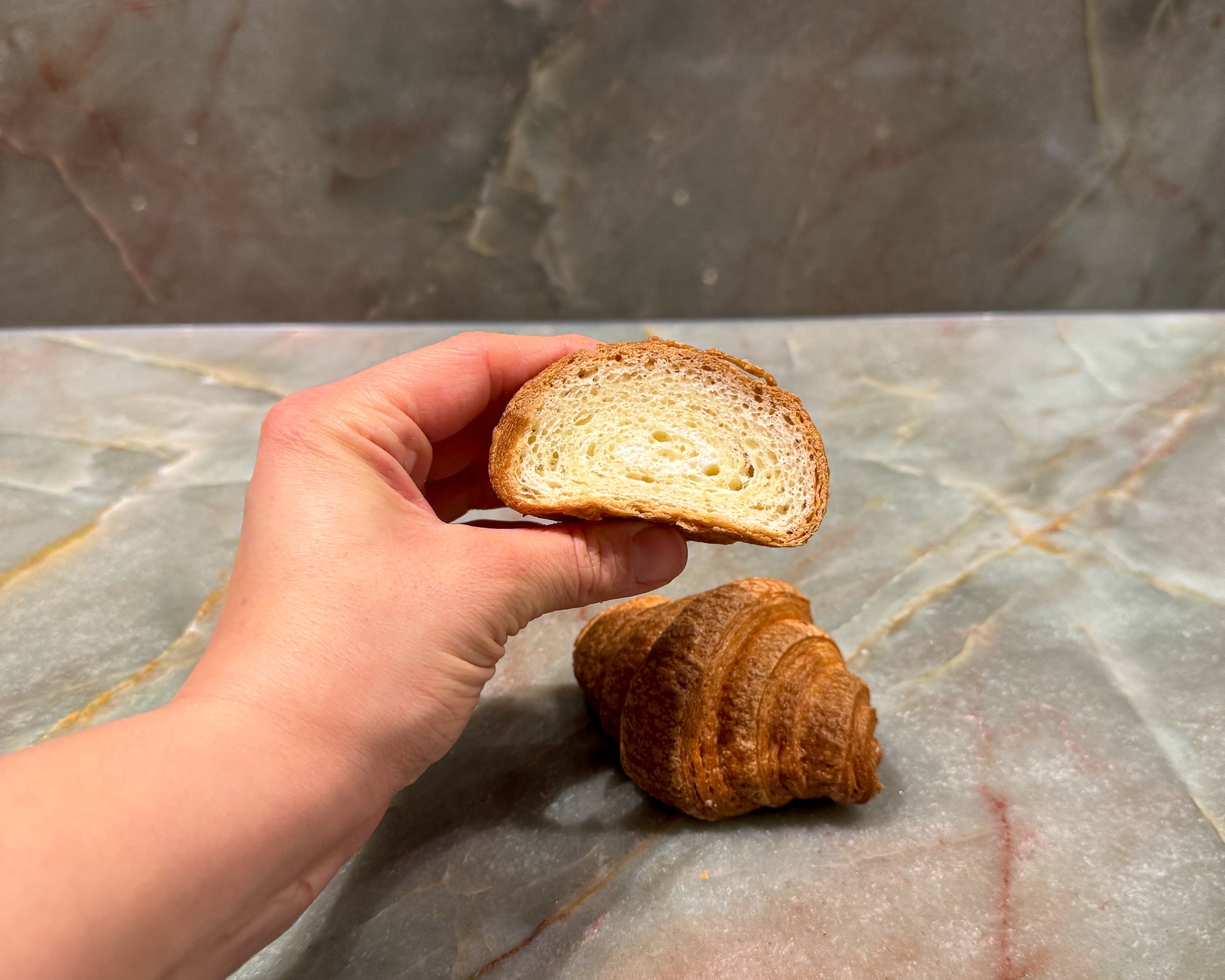 Unser veganes Croissant verbindet französische Handwerkskunst mit einer modernen pflanzlichen Rezeptur. Außen goldbraun und knusprig, innen zart und feinporig – so leicht, dass es beim Aufschneiden wirkt, als würde es schweben.